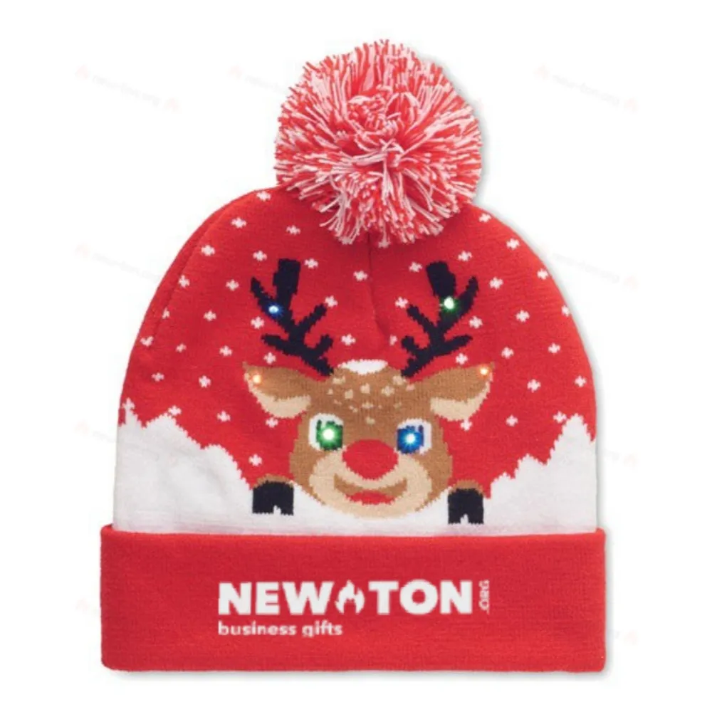 Рождественская вязаная шапка с 6 светодиодными лампочками (3 настройки света), манжетой и помпоном из мягкого акрила. 1 батарейка CR2032 в комплекте.