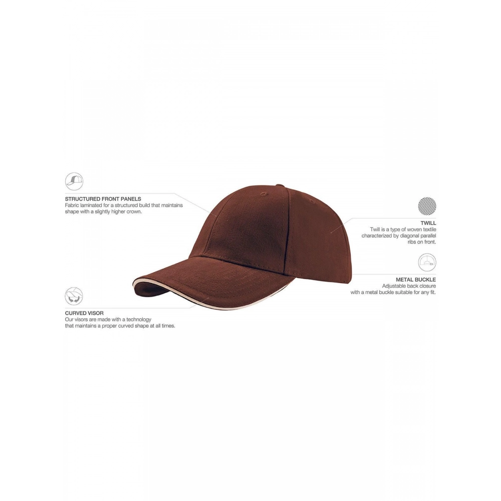 Кепка из 100% плотного расчесанного хлопка. 6 панелей, застежка с металлической пряжкой, потоотводящая лента, прошитые люверсы, укрепленная передняя панель, изогнутый козырек с шестью строчками. Универсальный размер. Съемная этикетка.