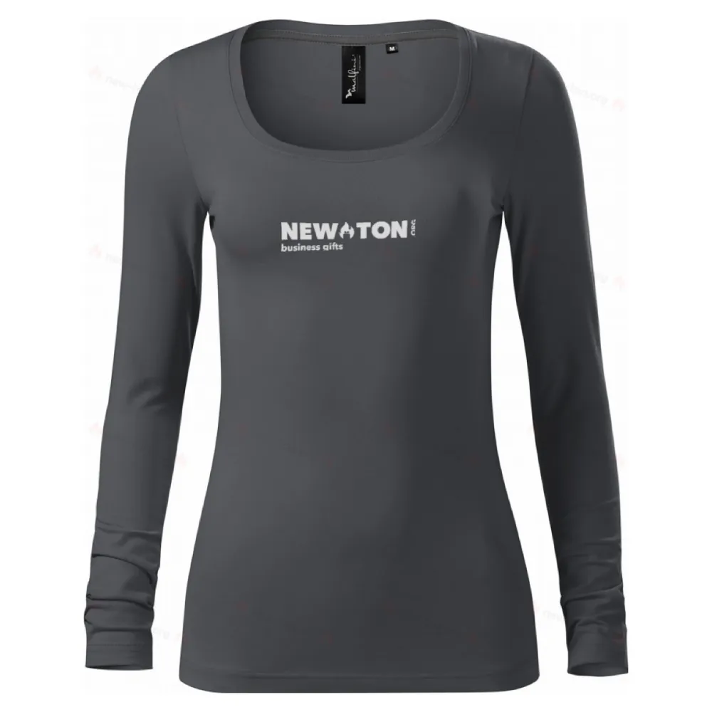 эластичная ткань для лучшей стабильности размеров узкий крой с боковыми швами более глубокий круглый вырез узкий трикотажный край горловины 1: 1 с 5% эластаном на внутренней стороне горловины сзади с контрастной лентой, фиксирующей плечевые швы длинные рукава
