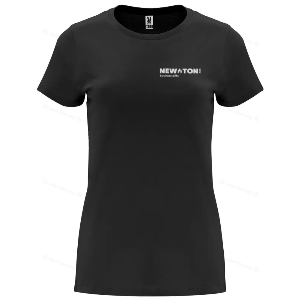 Приталенная футболка с коротким рукавом для женщин. Вырез-лодочка с 1x1 ребристой отделкой. Усиленные закрытые швы на воротнике. Съемная этикетка.