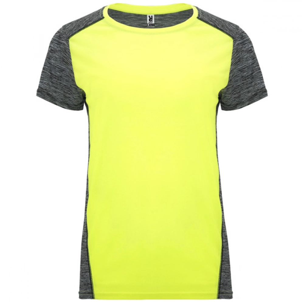 Женская техническая футболка с короткими рукавами. 1. Круглая горловина. 2. Сочетание двух тканей с полиэстера на спине, плечах и рукавах. 3. Основная ткань спереди — ткань bird's eye, и ткань space dye — сзади. 4. Спинка немного длиннее переда.