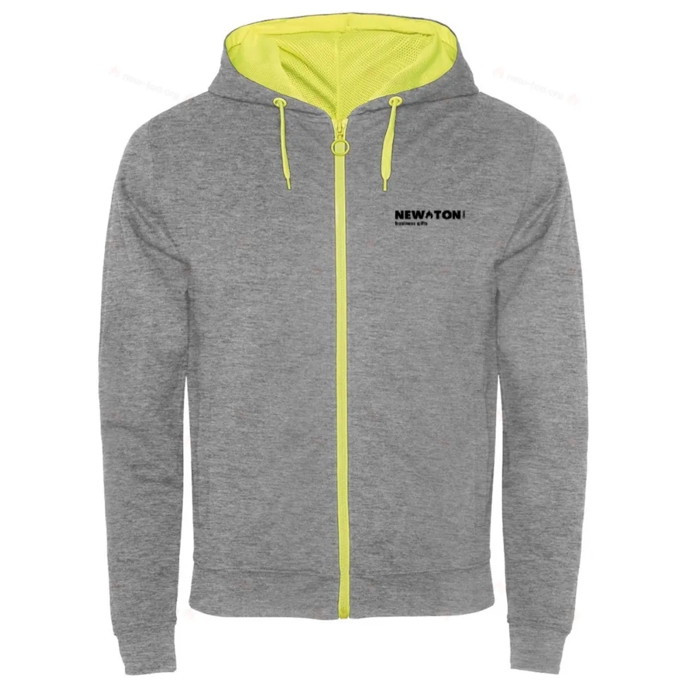Толстовка из нетертых флисовых материалов с деталями флуоресцентного цвета. Центральная молния с контрастным бегунком. Капюшон с подкладкой из микроперфорированной полиэстеровой ткани и контрастного флуоресцентного цвета. Шнурок и металлические люверсы контрастного флуоресцентного цвета. Манжеты и пояс из трикотажа 1x1. Два передних кармана с широкой отделкой. Усиленные закрытые швы на внутренней стороне воротника. Съемная этикетка.