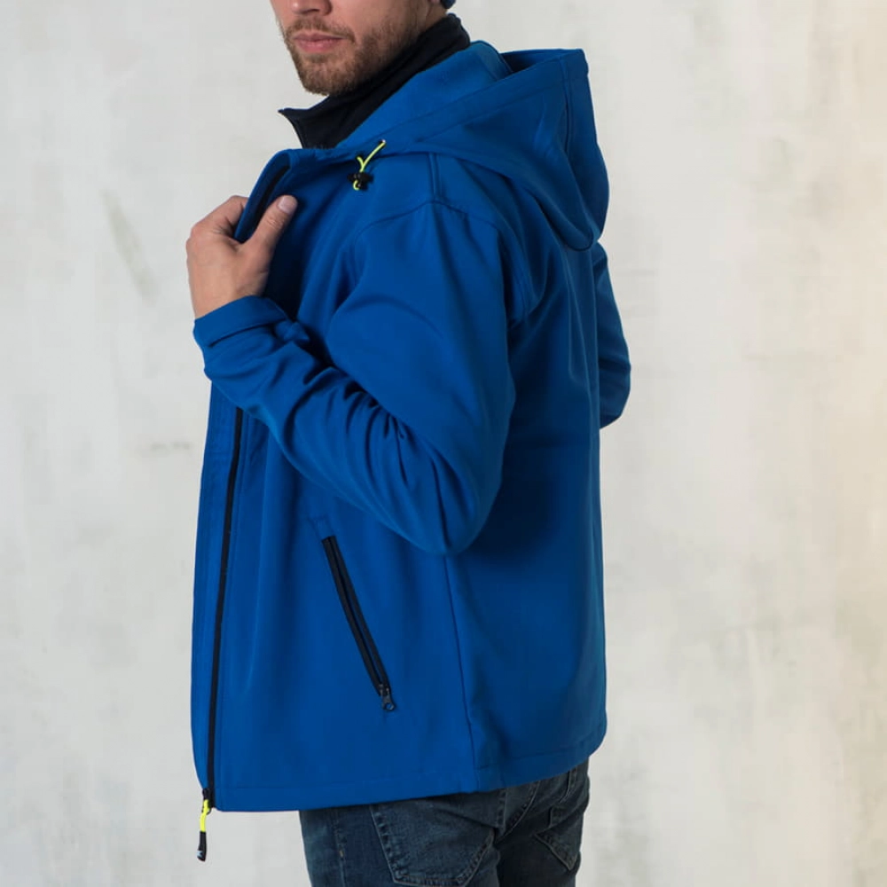 Ткань softshell. Водонепроницаемая и дышащая двухслойная куртка. Обратная облегченная пластиковая молния со съемным пуллером. Один нагрудный и два боковых кармана на молнии. Утягивающий шнурок по низу куртки. Регулируемые манжеты на липучке.