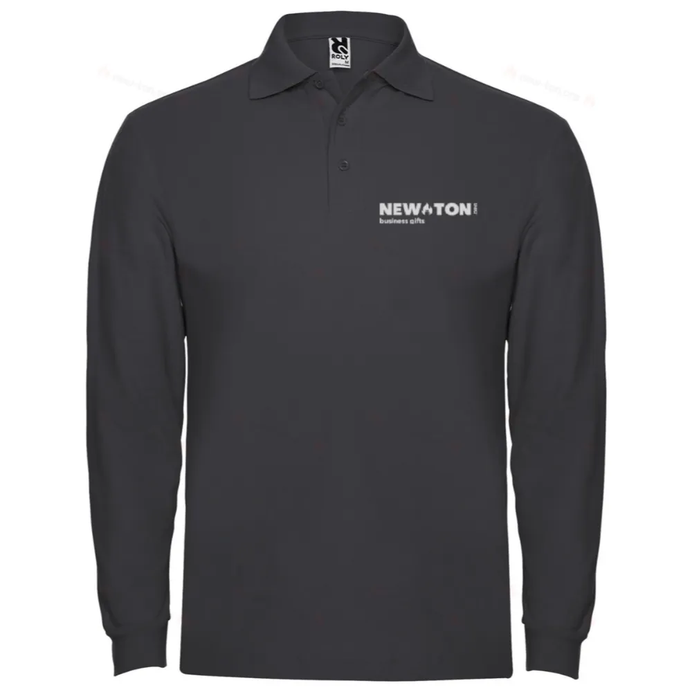 Поло с длинным рукавом, с ребристым воротником и манжетами, планкой на 3 пуговицы и манжетами из эластана 1x1. Усиленные закрытые швы на воротнике. Опциональный карман. Съемная этикетка. Модель ростом 190 см, носит размер L.