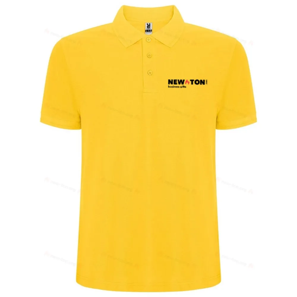 Футболка-поло с короткими рукавами. Воротник и края рукавов выполнены из ребристой ткани 1x1 с декоративными элементами. Планка с тремя пуговицами. Усиленные швы на воротнике. Боковые разрезы и опциональный карман. Съемная этикетка. Обработка против образования катышков.