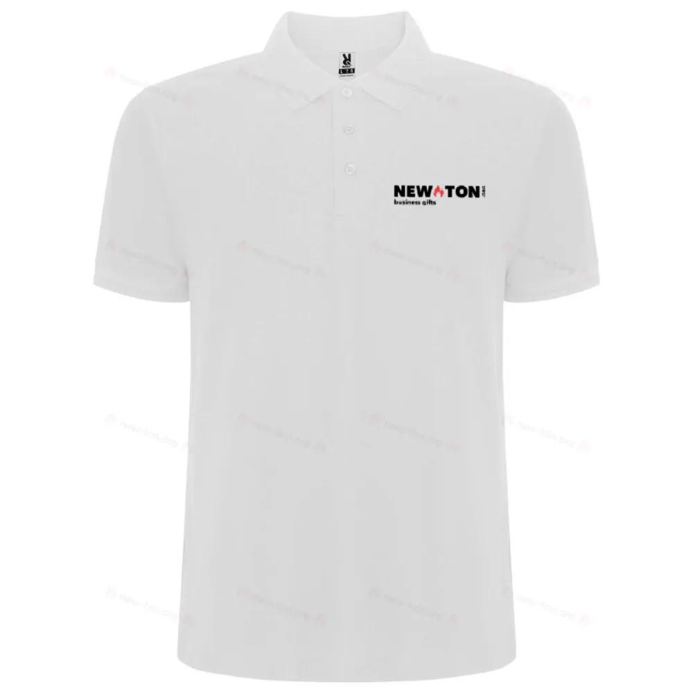 Футболка-поло с короткими рукавами. Воротник и края рукавов выполнены из ребристой ткани 1x1 с декоративными элементами. Планка с тремя пуговицами. Усиленные швы на воротнике. Боковые разрезы и опциональный карман. Съемная этикетка. Обработка против образования катышков.