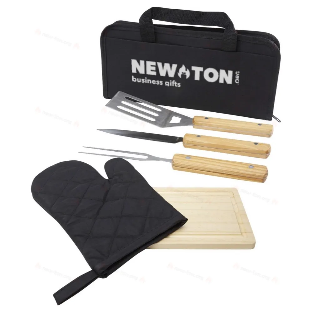 Набор для барбекю из 5 предметов: лопатка (29 x 7 см), вилка (29 x 1,7 см), нож (29 x 2,4 см), разделочная доска (19 x 13 x 1,1 см) и перчатка (25 x 16 см).