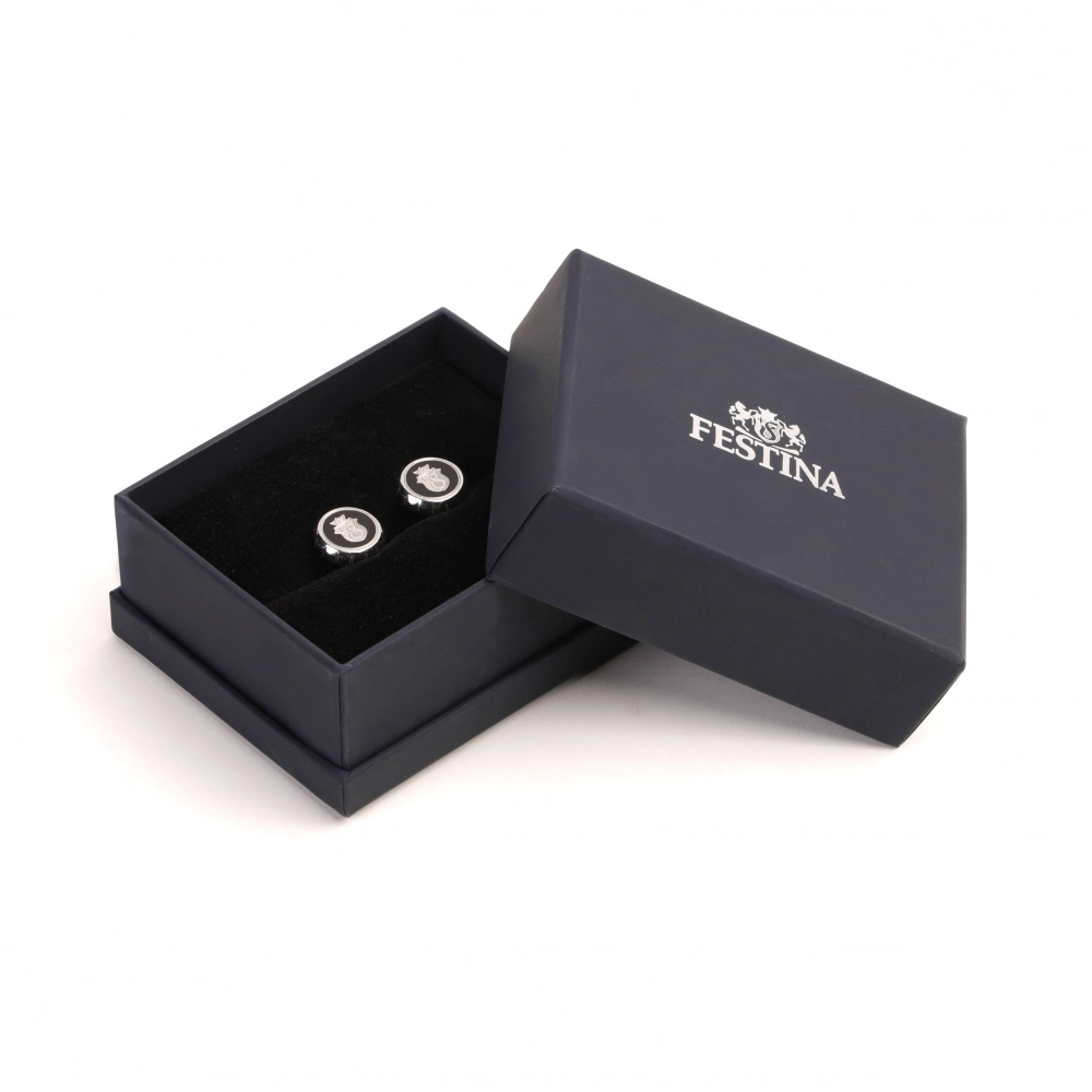 Запонки "Chronobike" вдохновлены культовой кнопкой остановки часов Festina и украшены фирменным гербом. Они изготовлены из нержавеющей стали. Эта блестящая хромированная версия, отделанная черной эмалью, - вечная классика.