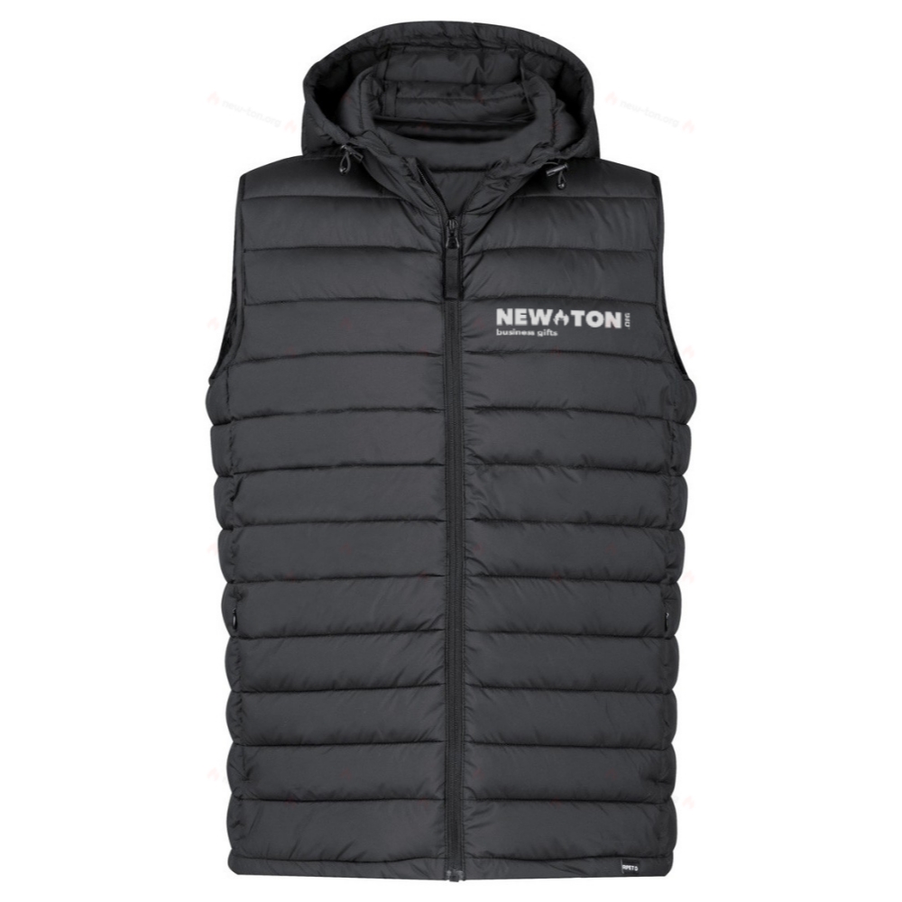 Ветро- и водонепроницаемый жилет-безрукавка с молнией, боковыми карманами на молнии и регулируемым капюшоном. В комплекте с сумкой из полиэстера RPET. 100% полиэстер RPET с характерным ярлыком RPET.
