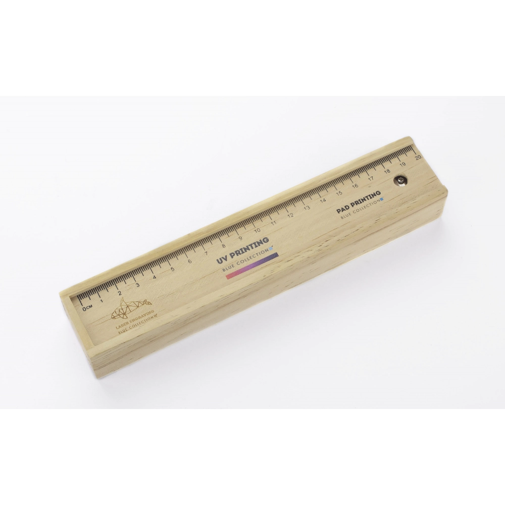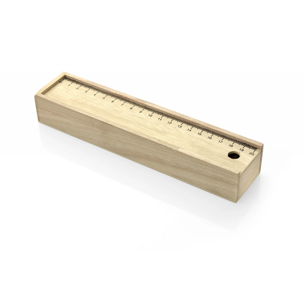 Деревянный пенал, укомплектованный 12 разноцветными карандашами, линейкой и ластиком. Логотип может быть выгравирован непосредственно на коробке.