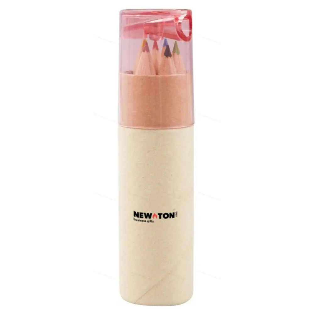 6 цветных карандашей в бумажном футляре с точилкой.