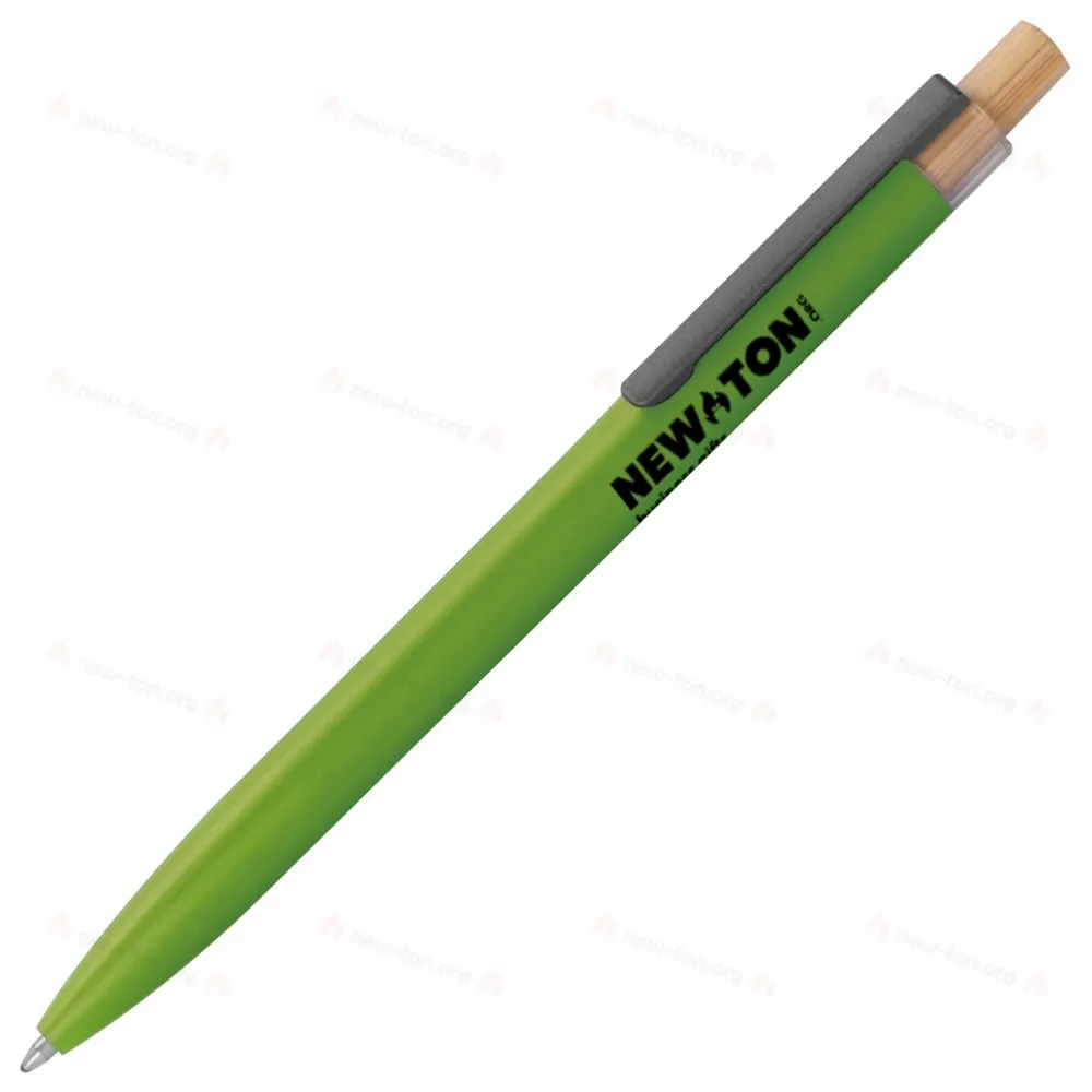 Ручка-шарик из переработанного алюминия с металлической клипсой, синим стержнем и бамбуковым толкателем.