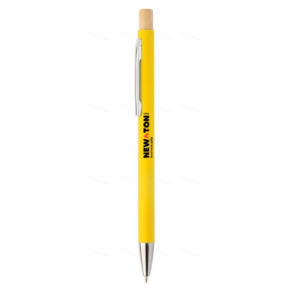 Шариковая ручка из переработанного алюминия с резиновым покрытием и кнопкой из бамбука и хромированными деталями. Специальное покрытие для зеркальной лазерной гравировки. С синим заправочным стержнем.