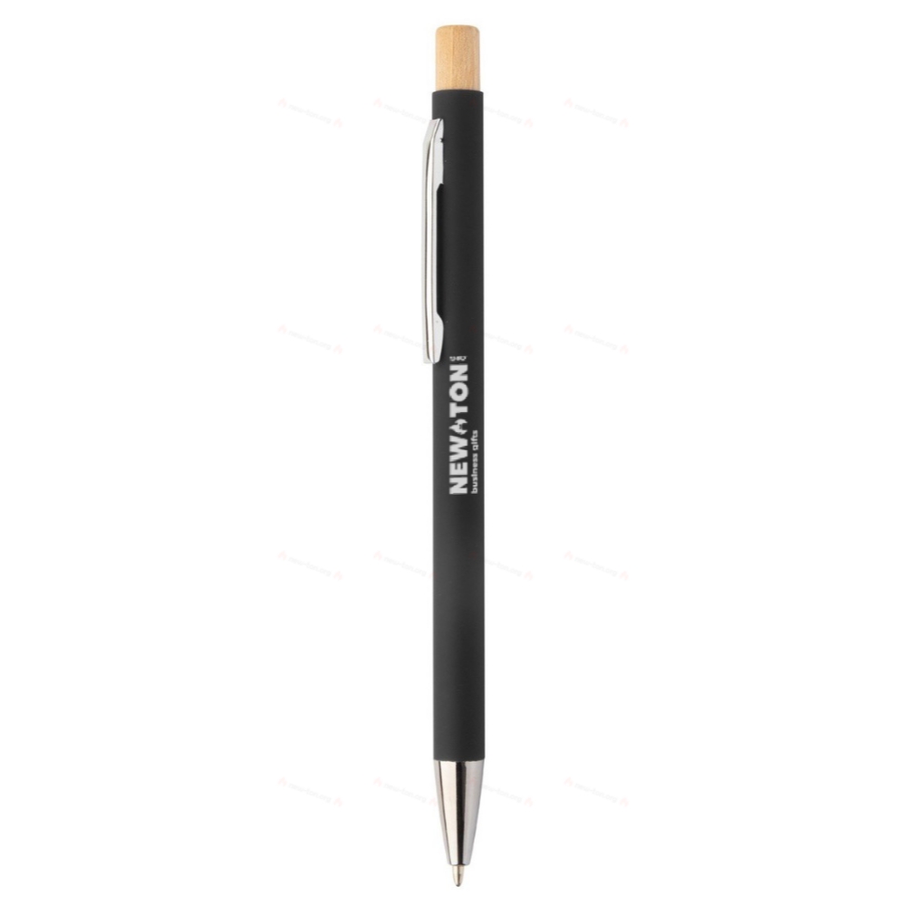 Шариковая ручка из переработанного алюминия с резиновым покрытием и кнопкой из бамбука и хромированными деталями. Специальное покрытие для зеркальной лазерной гравировки. С синим заправочным стержнем.