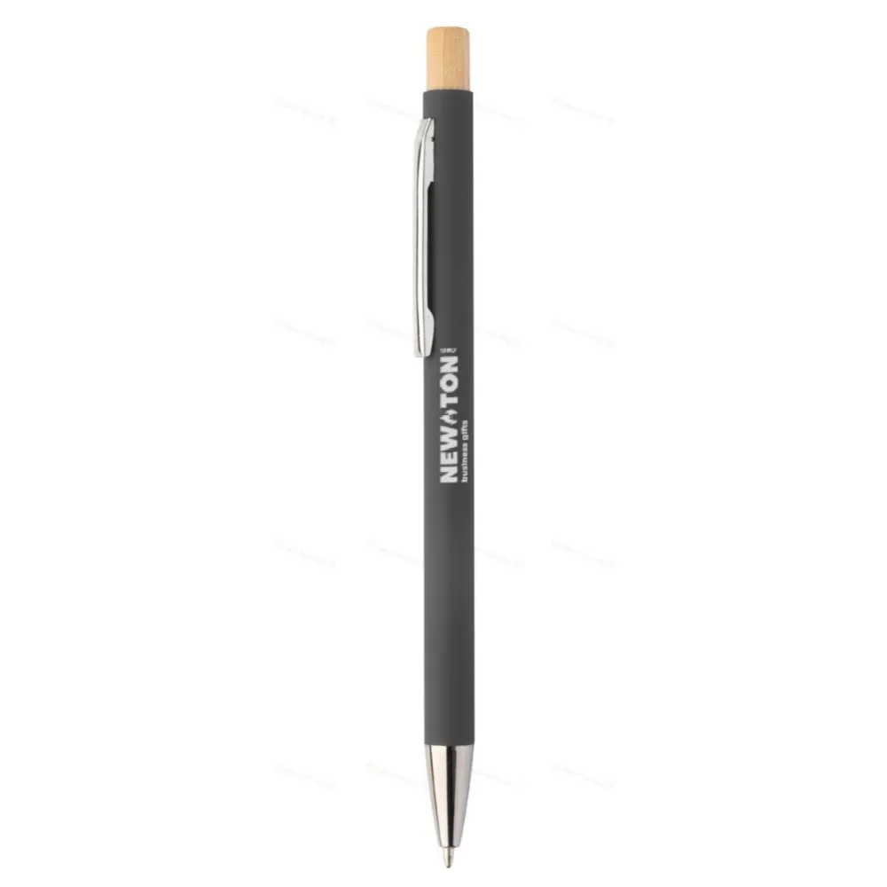 Шариковая ручка из переработанного алюминия с резиновым покрытием и кнопкой из бамбука и хромированными деталями. Специальное покрытие для зеркальной лазерной гравировки. С синим заправочным стержнем.