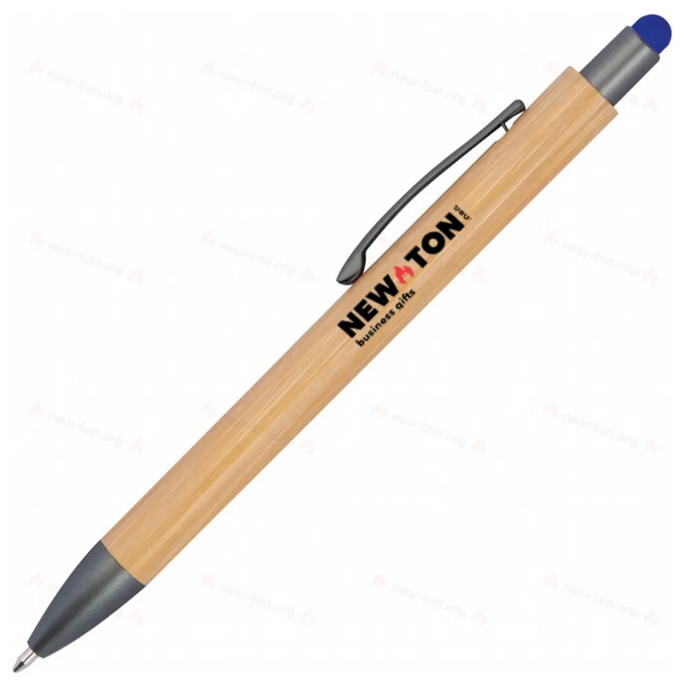 Шариковая ручка с бамбуковым покрытием, большим стержнем с синими чернилами, элементами антрацитового цвета и стилусом для сенсорного экрана.