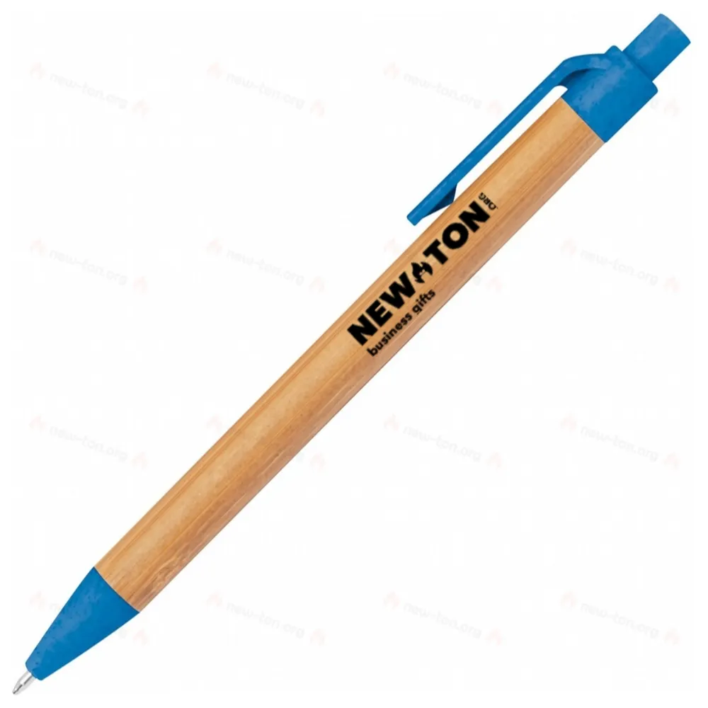 Выдвижная шариковая ручка из бамбука с цветными вставками из соломы и синим стержнем.