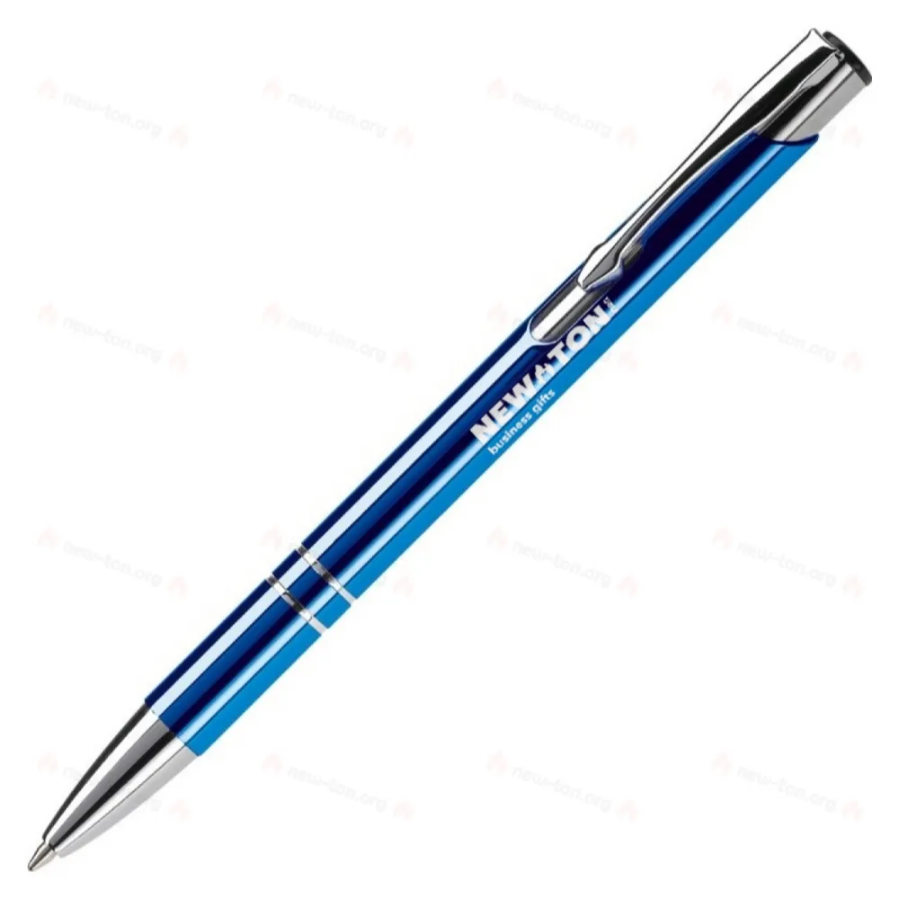 Элегантная алюминиевая ручка. С двумя кольцами в корпусе ручки как примечательная деталь. Пластиковый стержень с синими чернилами.