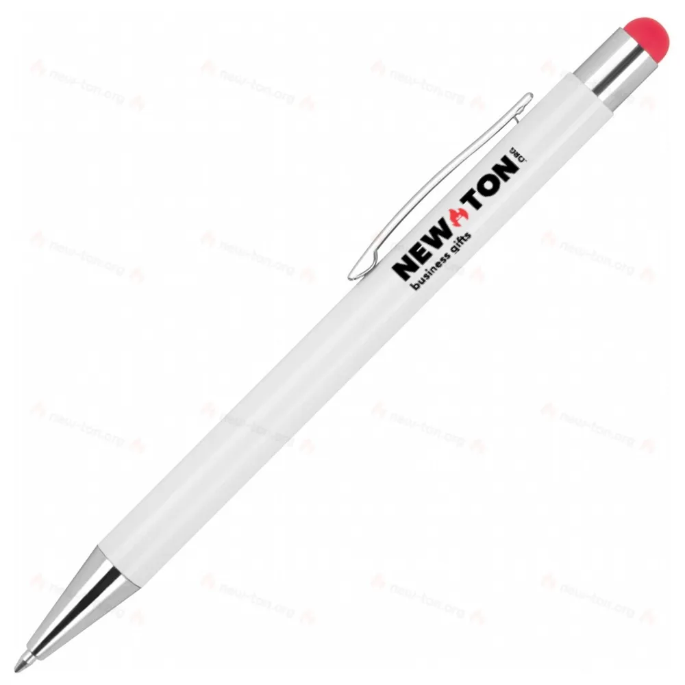 Алюминиевая шариковая ручка с серебряными аппликациями, сенсорной функцией и синим стержнем для письма.