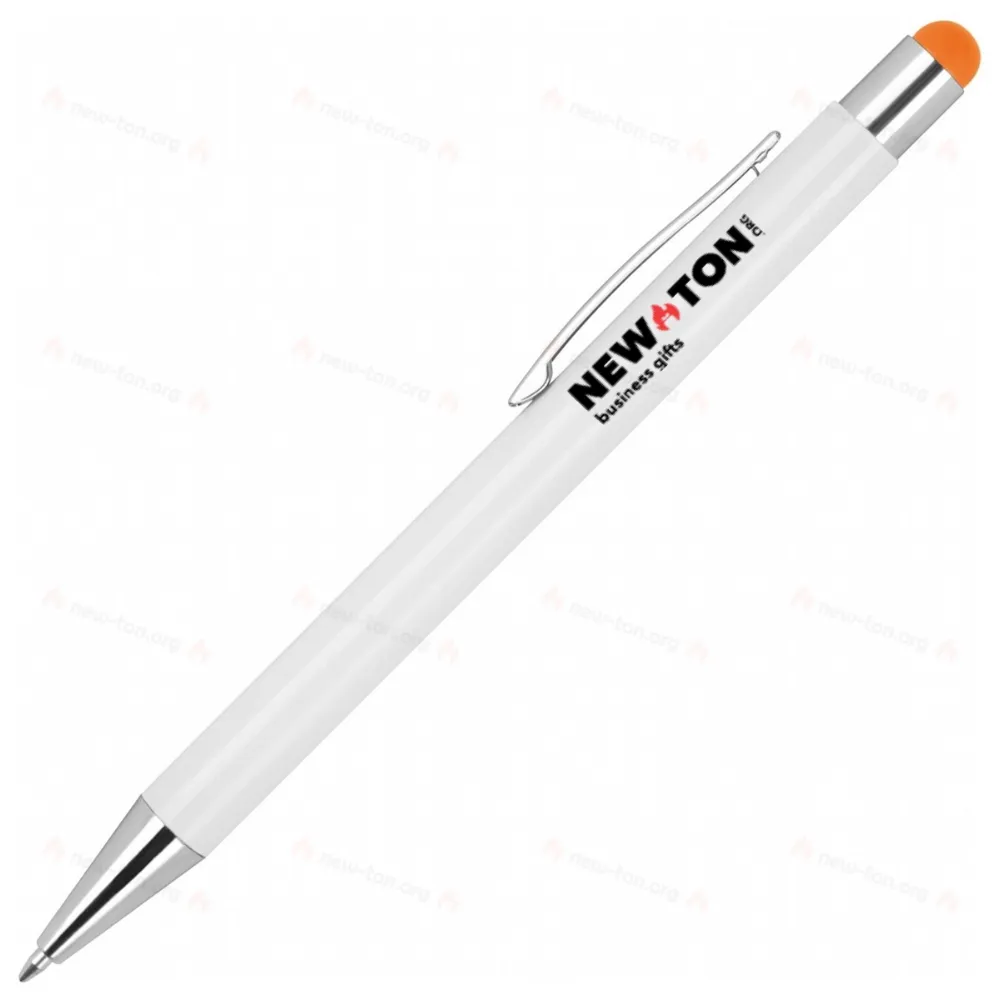 Алюминиевая шариковая ручка с серебряными аппликациями, сенсорной функцией и синим стержнем для письма.