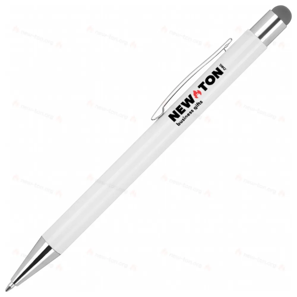Алюминиевая шариковая ручка с серебряными аппликациями, сенсорной функцией и синим стержнем для письма.