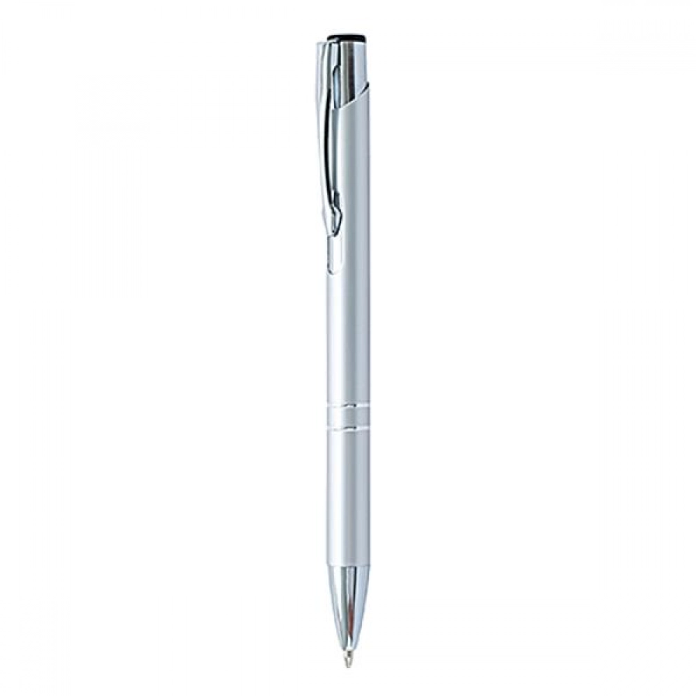 Металлическая шариковая ручка с двумя декоративными кольцами, с механизмом push-in, пишет черным цветом.
