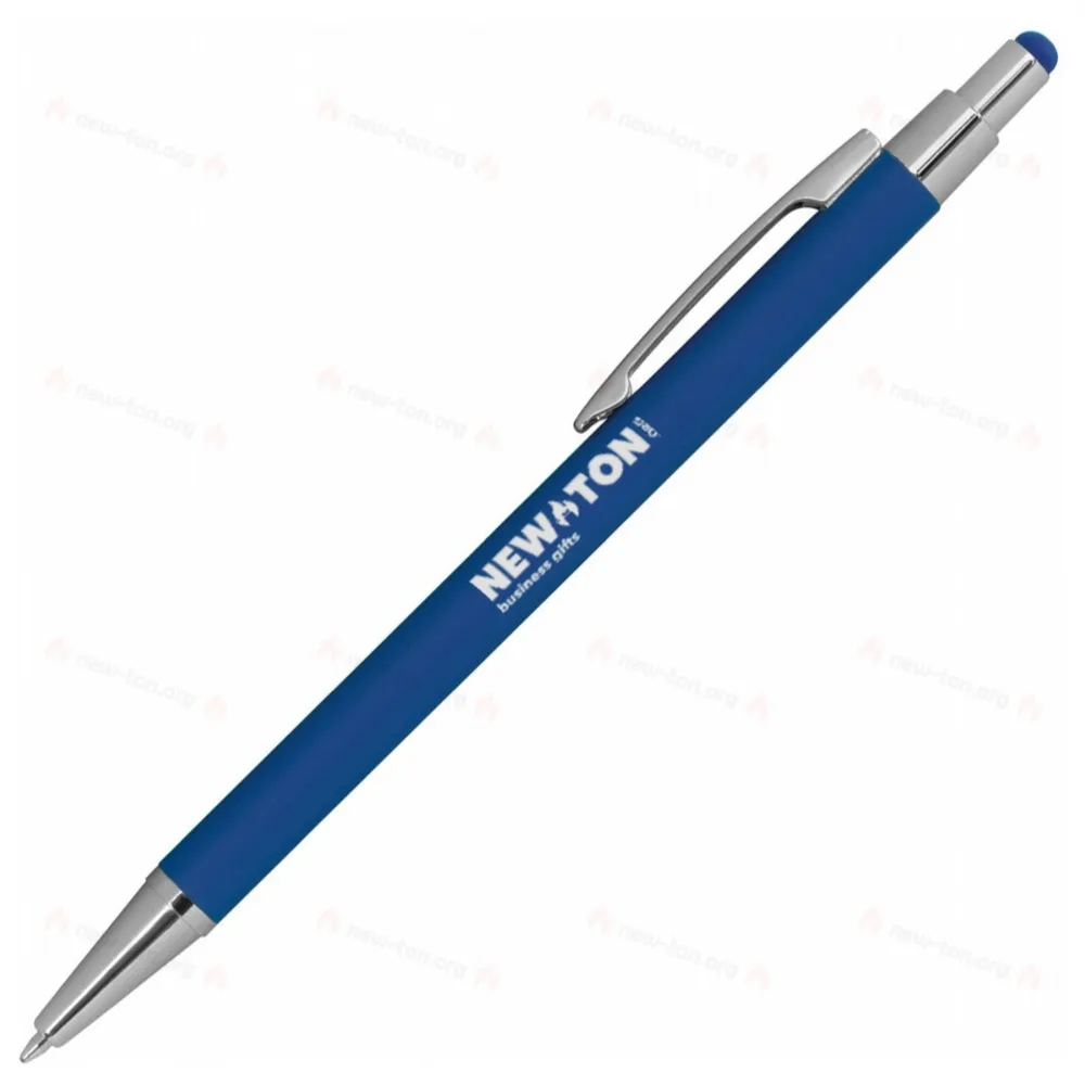Тонкая металлическая ручка с резиной на поверхности. Имеет чернила синего цвета и стилус для сенсорных экранов.