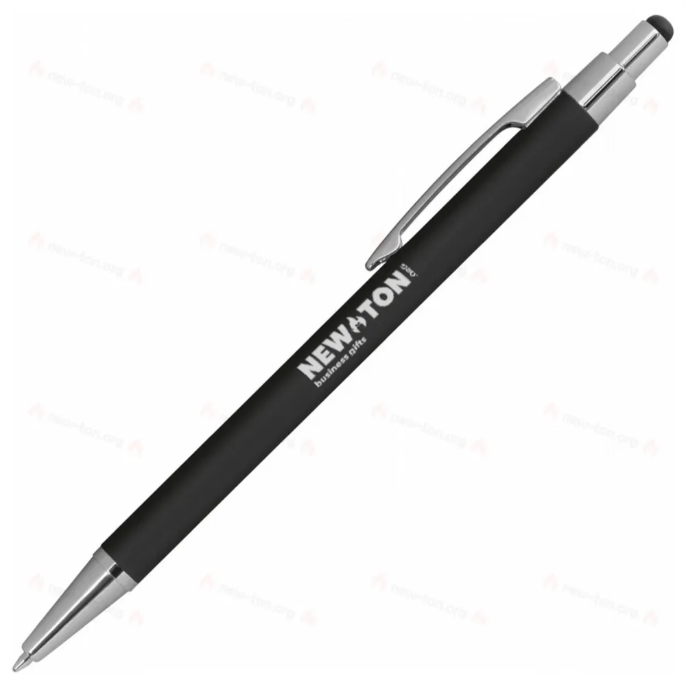 Тонкая металлическая ручка с резиной на поверхности. Имеет чернила синего цвета и стилус для сенсорных экранов.