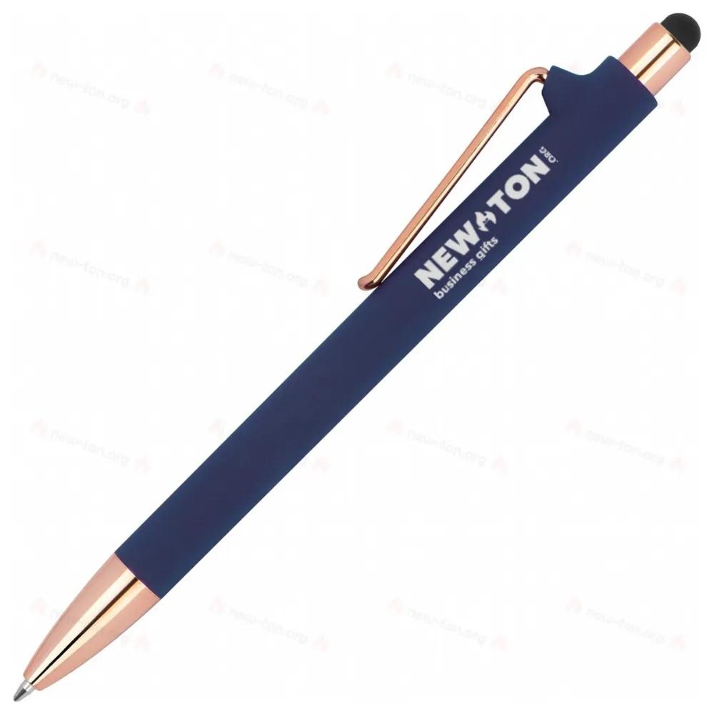 Резиновая ручка с элементами цвета розового золота, синим стержнем, экстравагантной клипсой и функцией сенсорного экрана.