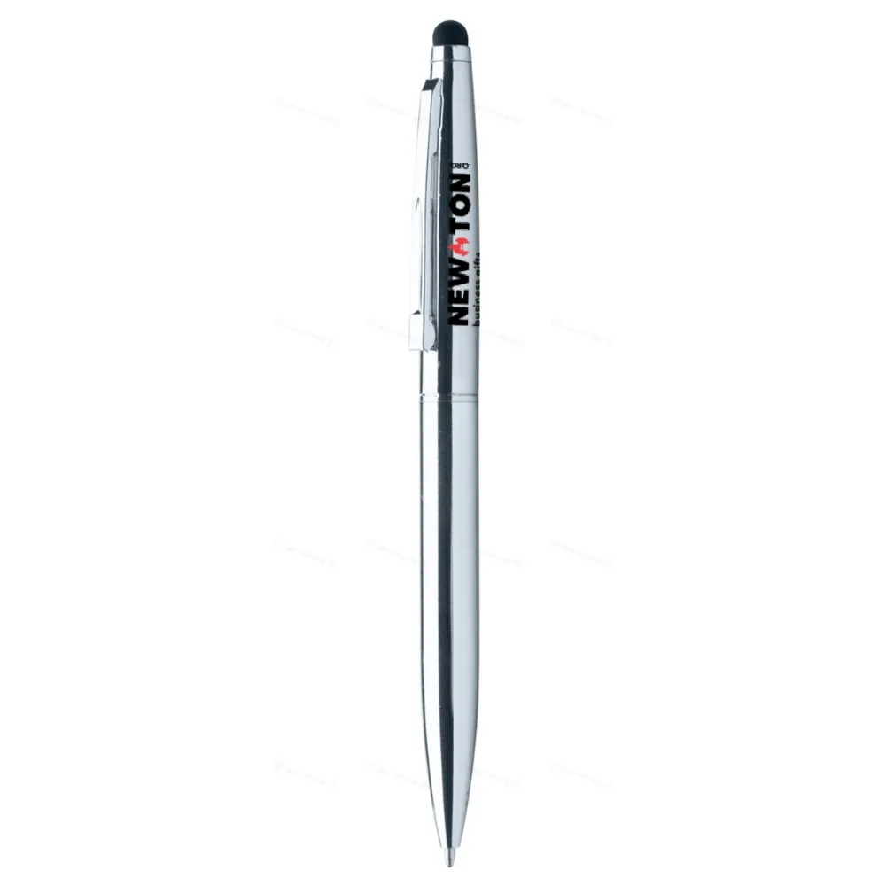 Металлическая шариковая ручка и ручка для сенсорного экрана с блестящей металлической отделкой. С синим стержнем.