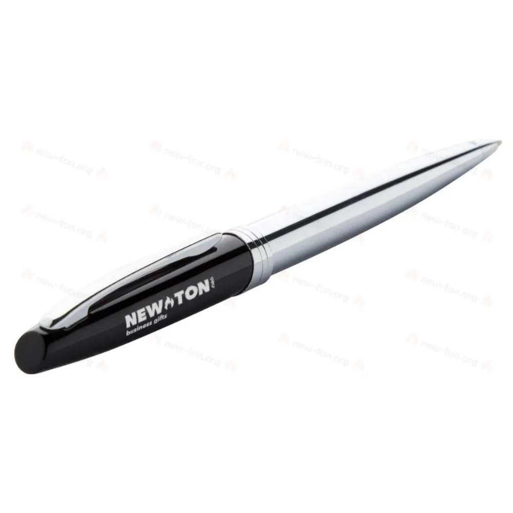 Металлическая шариковая ручка с черным лакированным колпачком, блестящим хромированным корпусом и зажимом. В подарочной коробке с синим наполнителем.