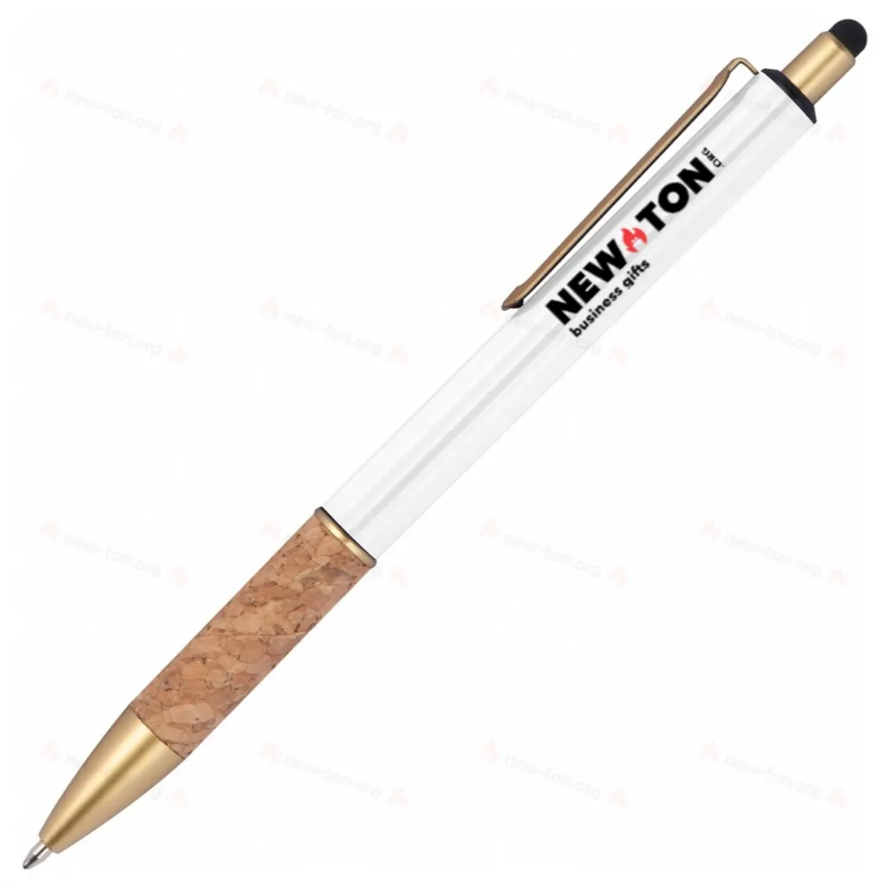 Металлическая ручка с золотыми деталями и пробковым захватом. Ручка пишет синим цветом.