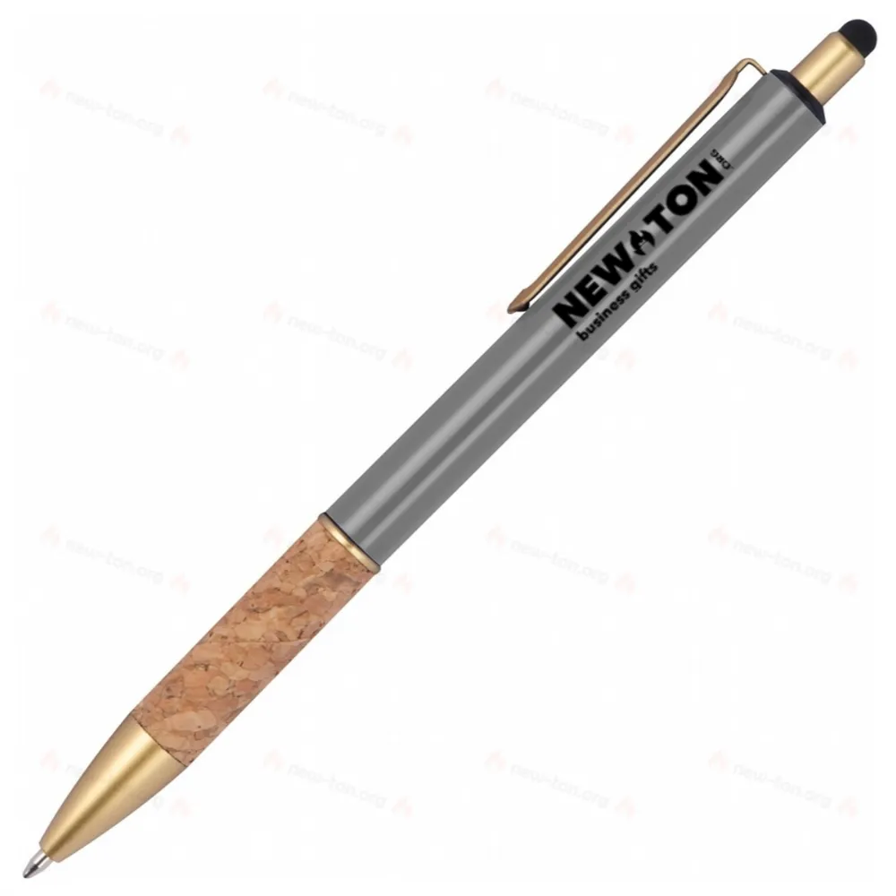 Металлическая ручка с золотыми деталями и пробковым захватом. Ручка пишет синим цветом.