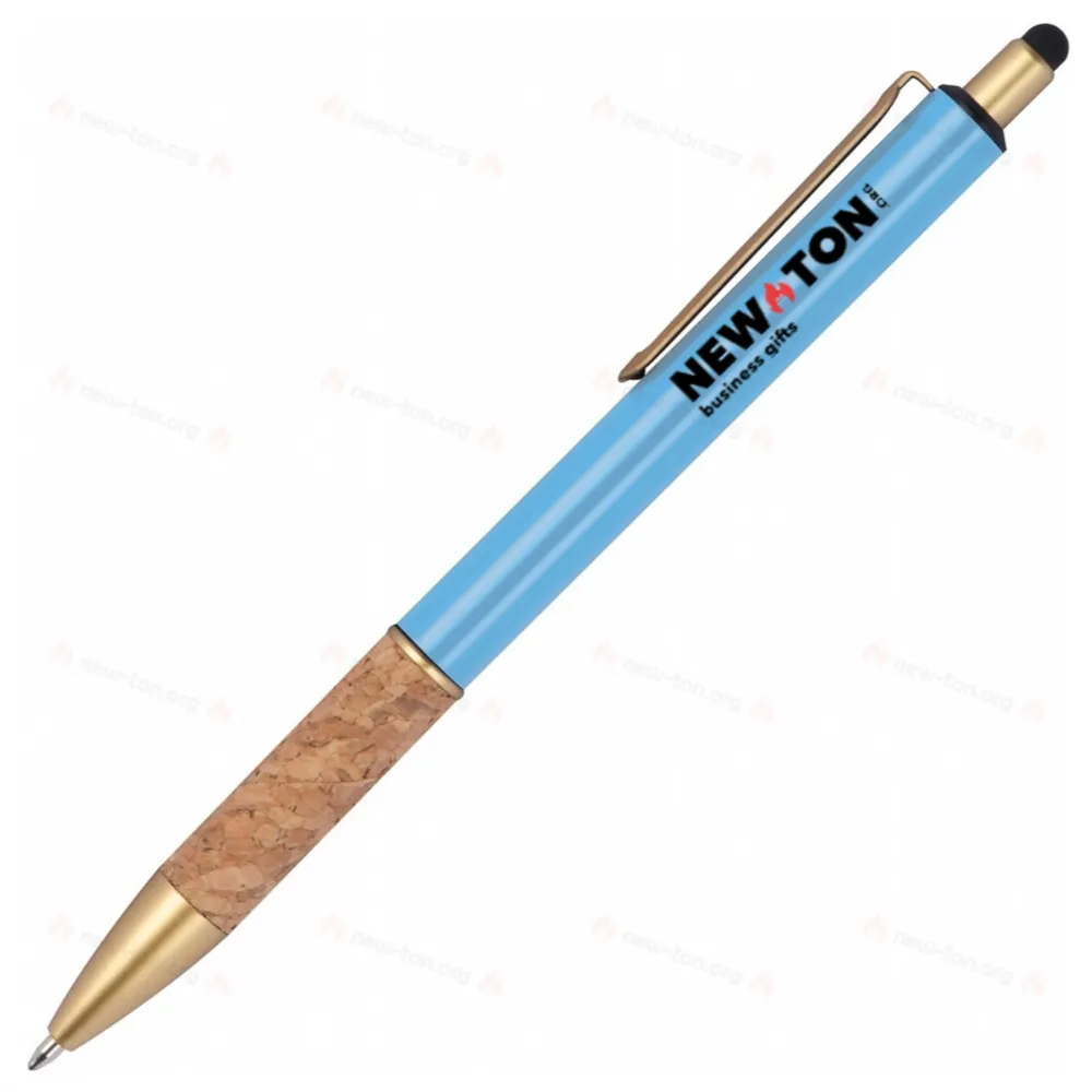Металлическая ручка с золотыми деталями и пробковым захватом. Ручка пишет синим цветом.
