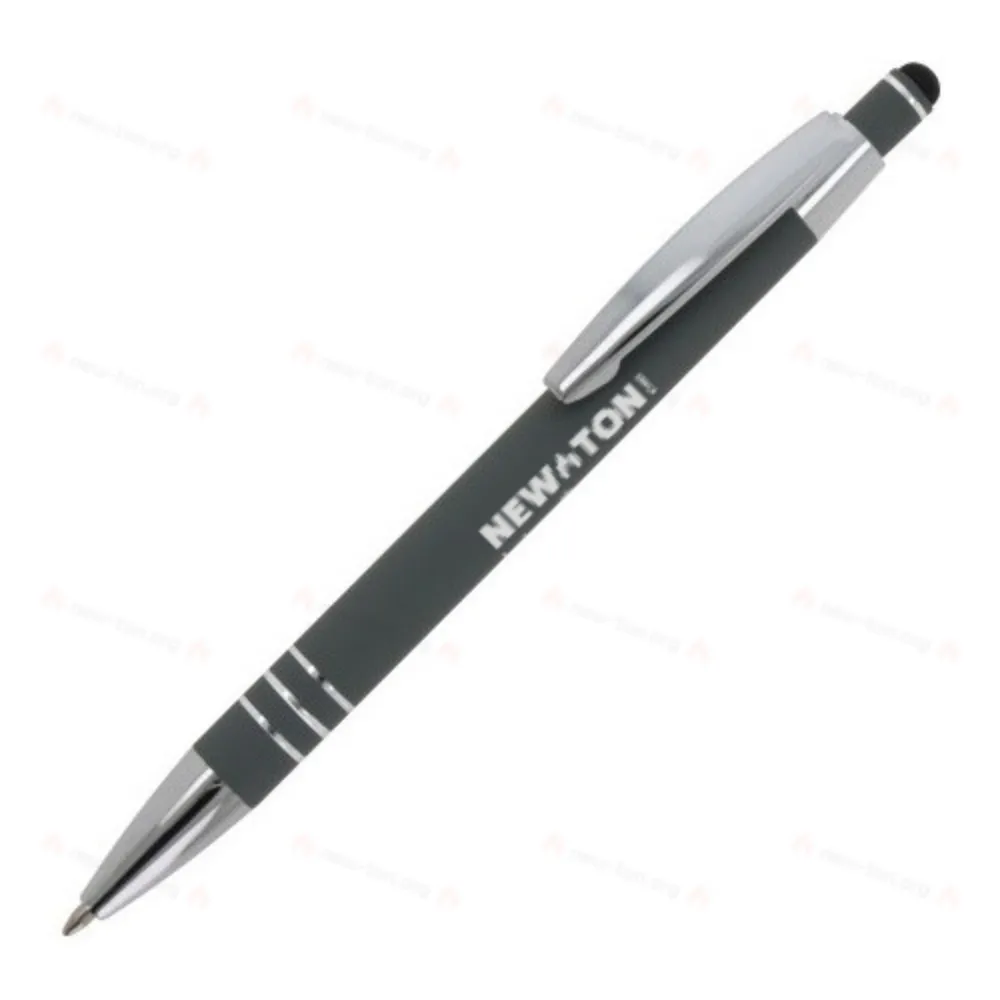 Алюминиевая шариковая ручка с элегантным покрытием soft-touch и стилусом. С прочным металлическим зажимом и наконечником. Цвет надписи: синий.