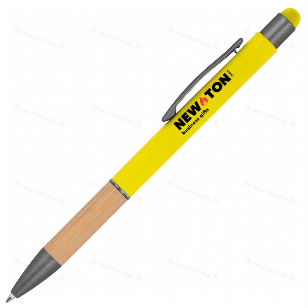 Металлическая шариковая ручка с синими чернилами, наконечником для сенсорного экрана и зоной захвата из бамбука.