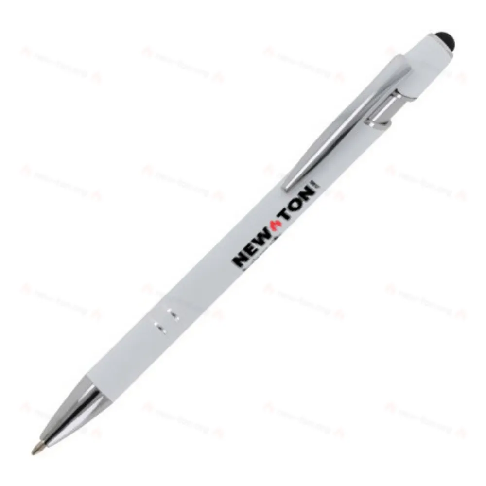 Алюминиевая шариковая ручка с элегантным покрытием soft-touch и стилусом. С прочным металлическим зажимом и наконечником. Цвет надписи: синий.