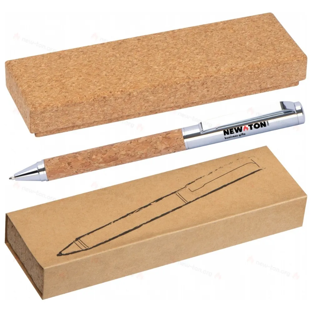 Элегантная ручка из пробки с металлическими элементами. Ручка имеет синий стержень и упакована в пробковый футляр.