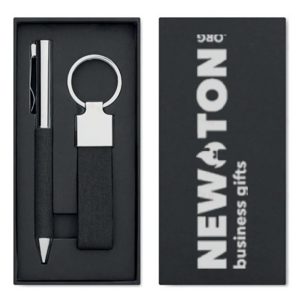 Подарочный набор из 2 предметов. В набор входят металлическая шариковая ручка и брелок для ключей из переработанного полиэстера. Синие чернила.