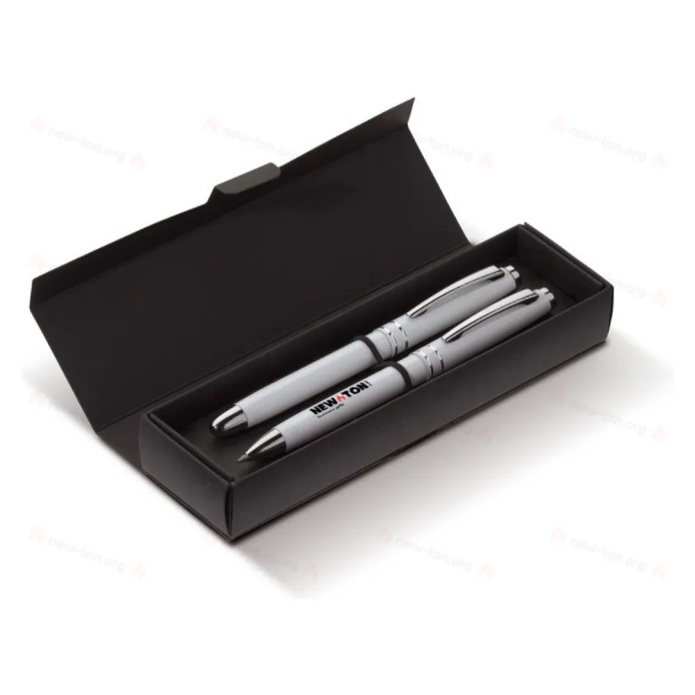Металлический письменный набор с шариковой ручкой и роллером. Шариковая ручка с функцией поворота. Роллер с кепкой. Синий стержень. Стильный верх ручки и два кольца серебристого цвета.
