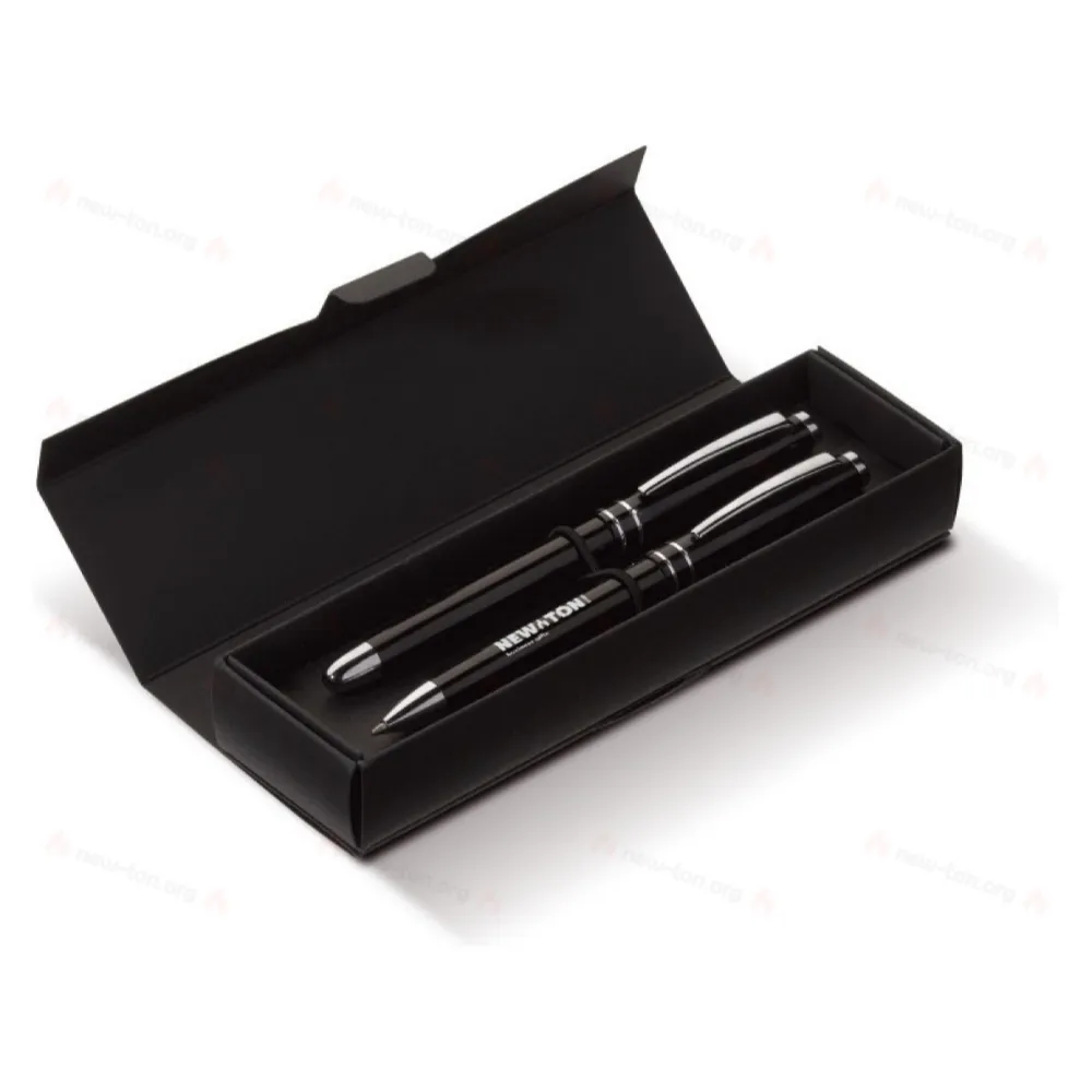 Металлический письменный набор с шариковой ручкой и роллером. Шариковая ручка с функцией поворота. Роллер с кепкой. Синий стержень. Стильный верх ручки и два кольца серебристого цвета.
