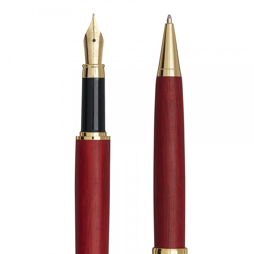 Элегантный набор ручек POET состоит из шариковой ручки и перьевой ручки с корпусом из розового дерева и золотыми блестящими украшениями, упакован в деревянный футляр
