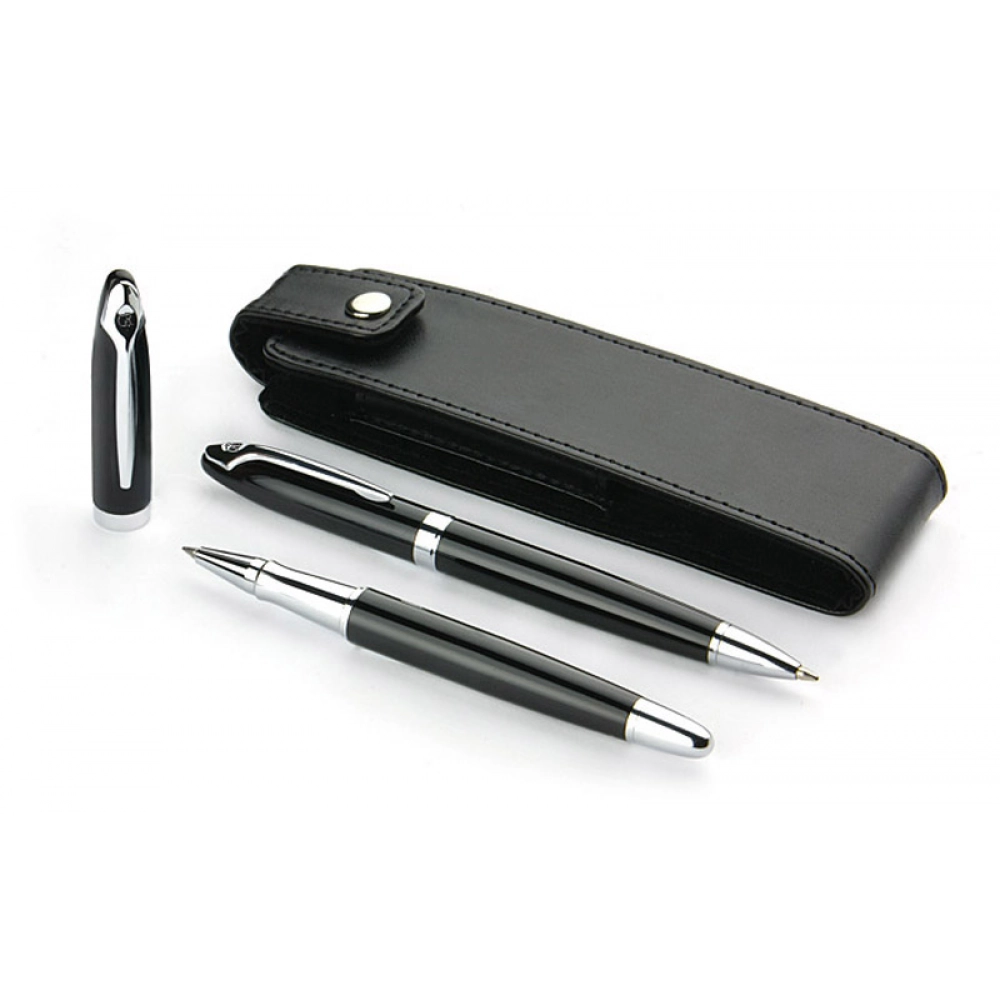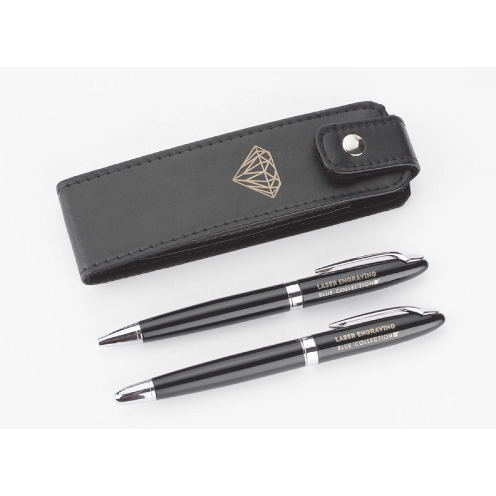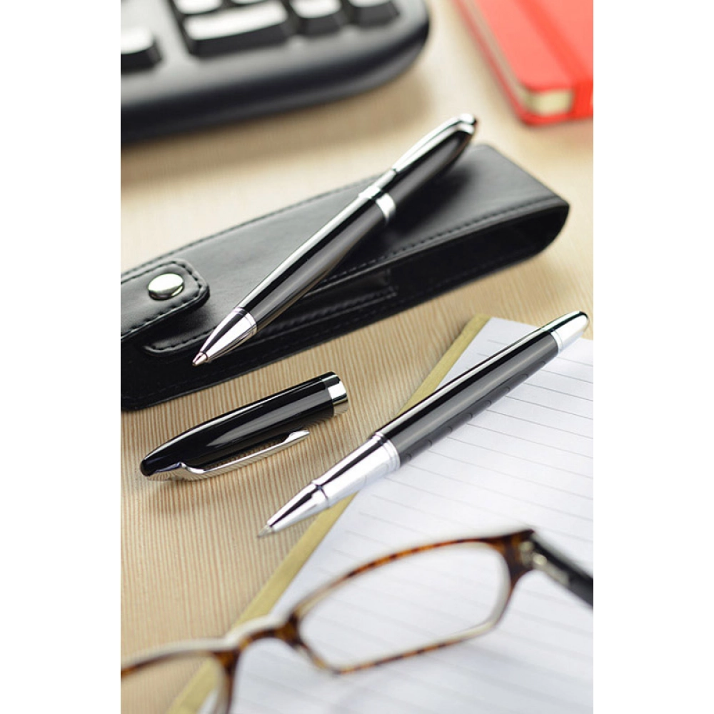 Элегантный набор для письма, состоящий из шариковой и роллерной ручек. Упакован в футляр из материала, имитирующего кожу (PU). Мы можем нанести гравировку с логотипом на пишущие инструменты.