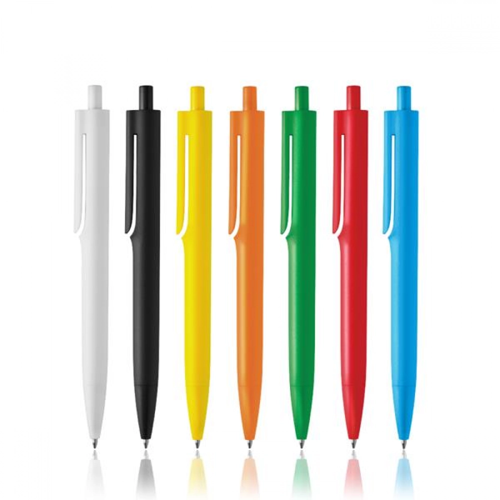 Одноцветная пластиковая шариковая ручка с механизмом push-in, пишет синим цветом.