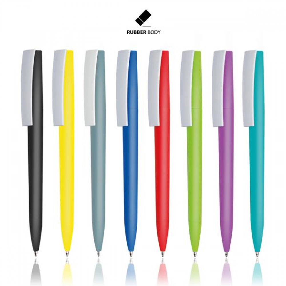 Пластиковая ручка с прорезиненным покрытием soft touch, поворотным механизмом и большим зажимом. Он пишет черным цветом.