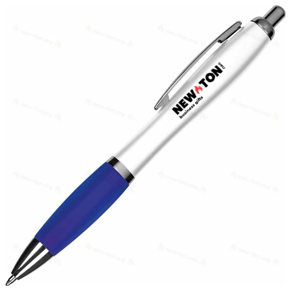 Пластиковая ручка с белым корпусом и цветной резинкой. Имеет металлический клип и большой синий стержень. Логотип можно разместить под клипом.
