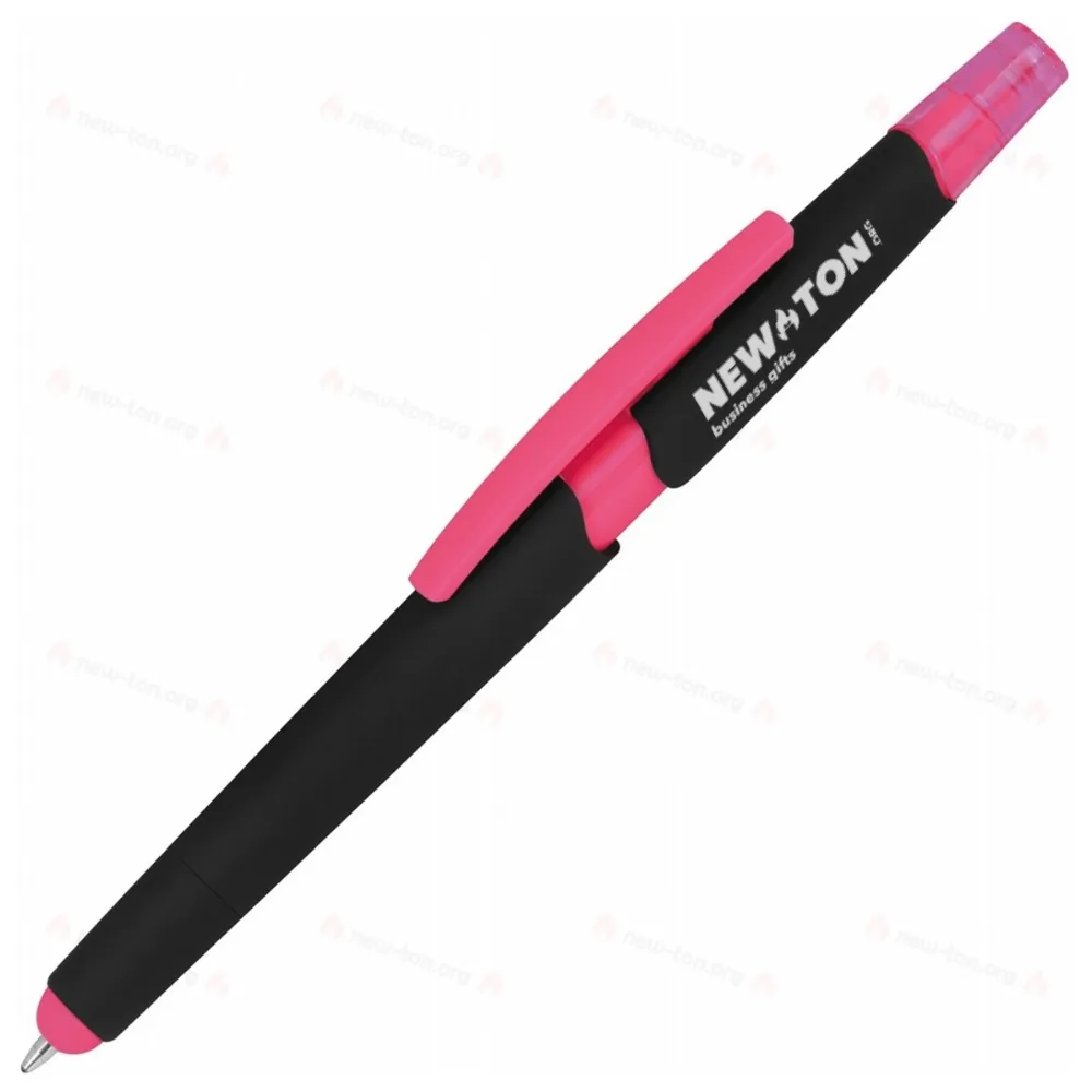 Пластиковая ручка с маркером. Ручка имеет прорезиненную поверхность, синий картридж и стилус для обработки сенсорных экранов.
