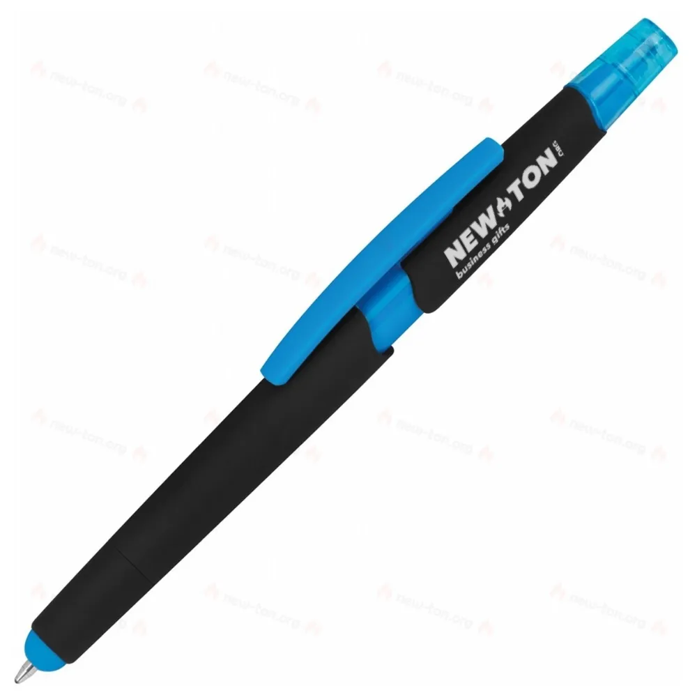 Пластиковая ручка с маркером. Ручка имеет прорезиненную поверхность, синий картридж и стилус для обработки сенсорных экранов.