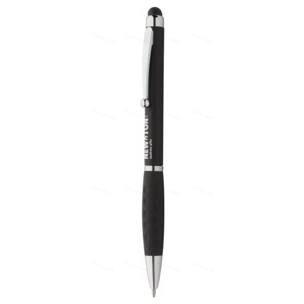 Пластиковая шариковая ручка и ручка для сенсорного экрана с резиновой ручкой и синим стержнем.