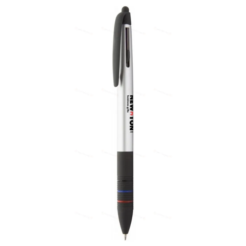 Пластиковая шариковая ручка и ручка для сенсорного экрана с прорезиненной ручкой и матовым металлическим покрытием. С 3-мя цветными стержнями: черным, синим и красным.